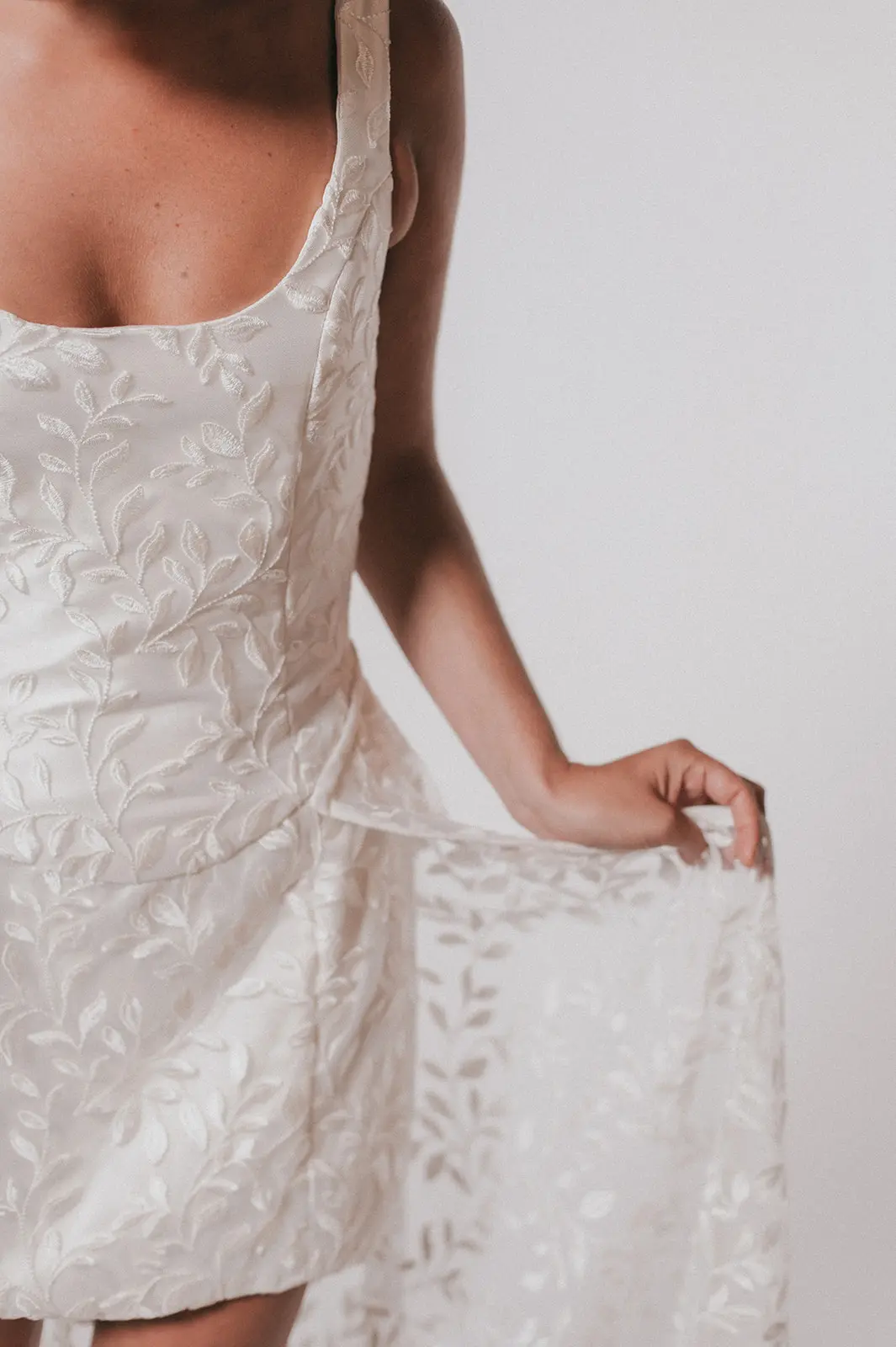 Cada vestido da coleção Short Stories é meticulosamente confecionado para garantir conforto e elegância, com linhas simples e detalhes subtis que celebram a beleza natural de cada noiva.