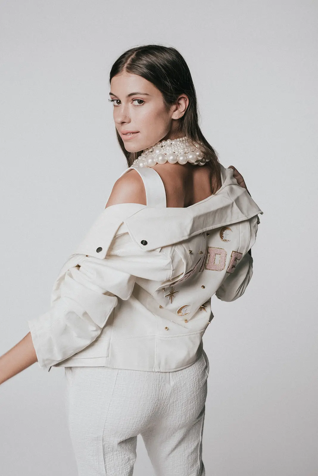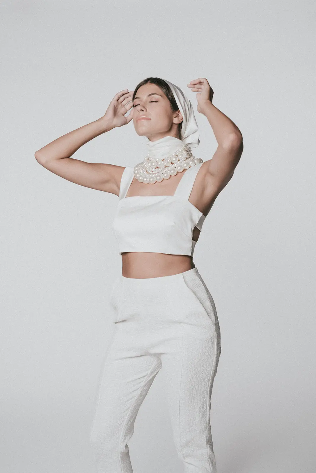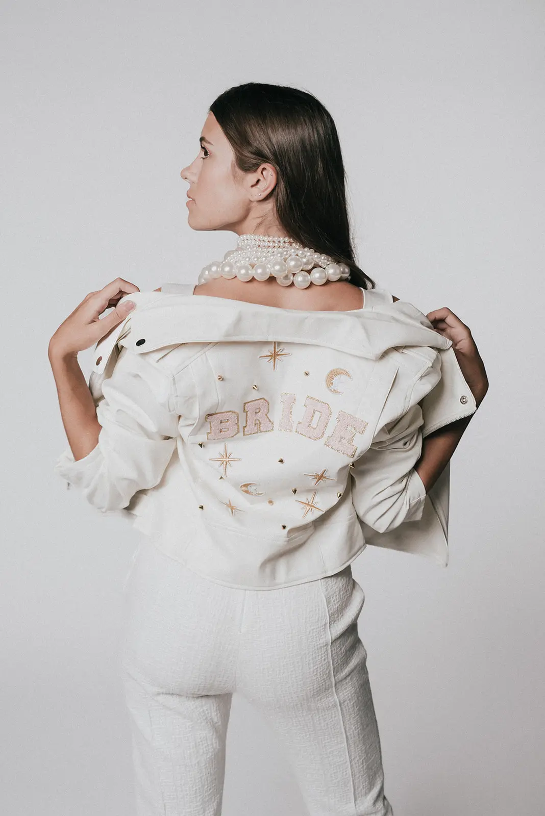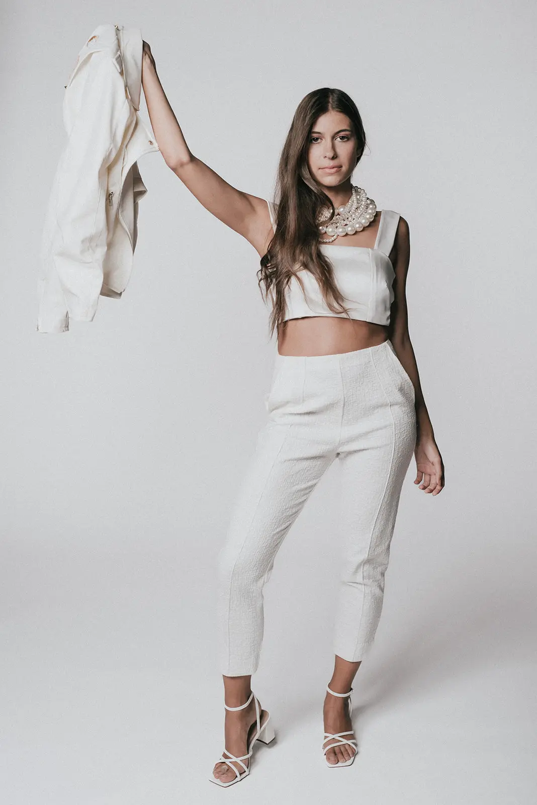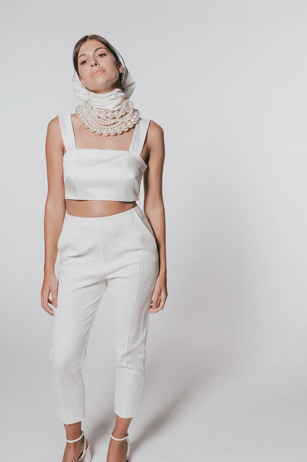 Coordenado que simboliza a liberdade e a aventura, ideal para noivas que querem um toque de rebeldia e preferem calças em vez de saias.