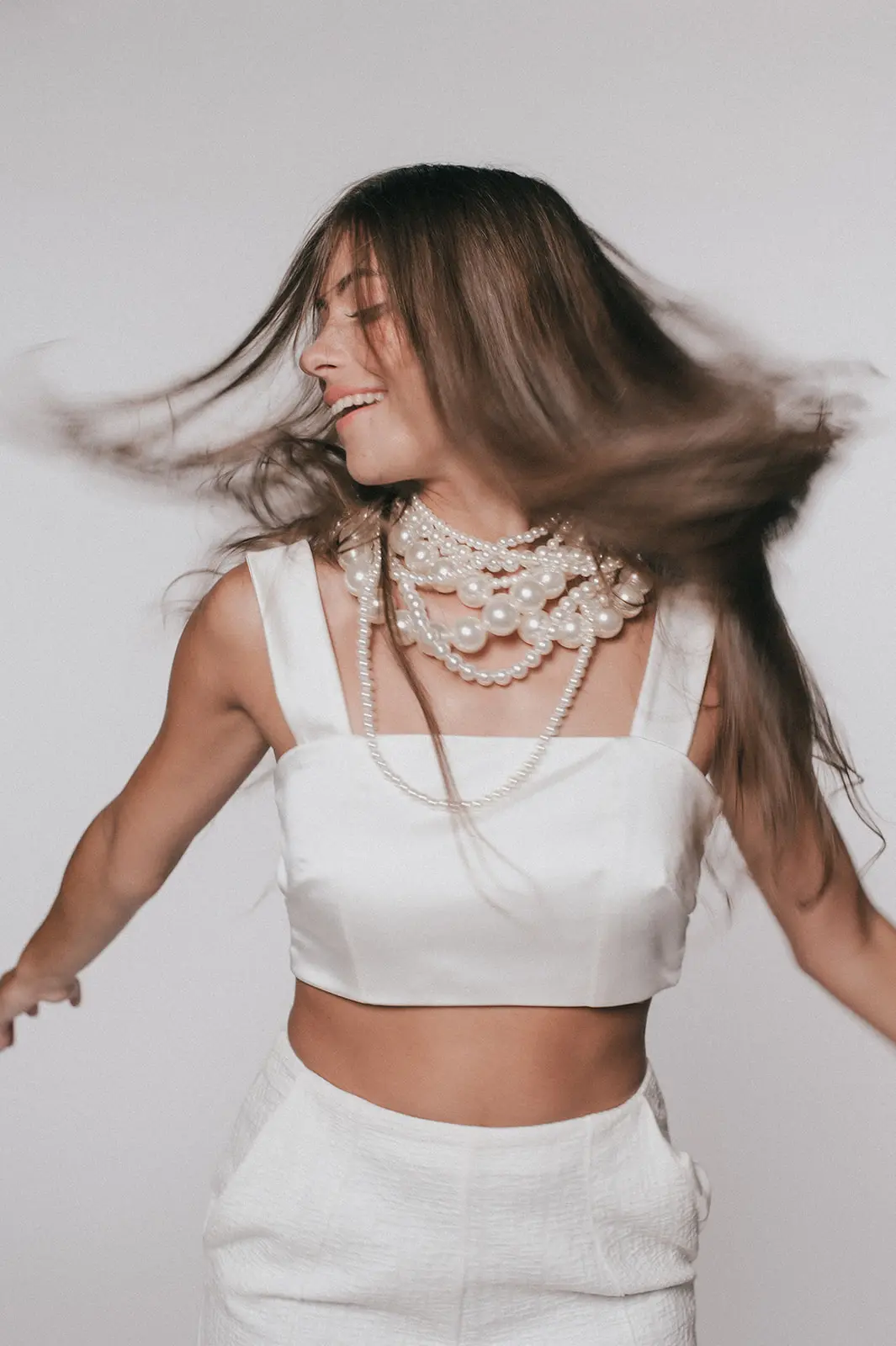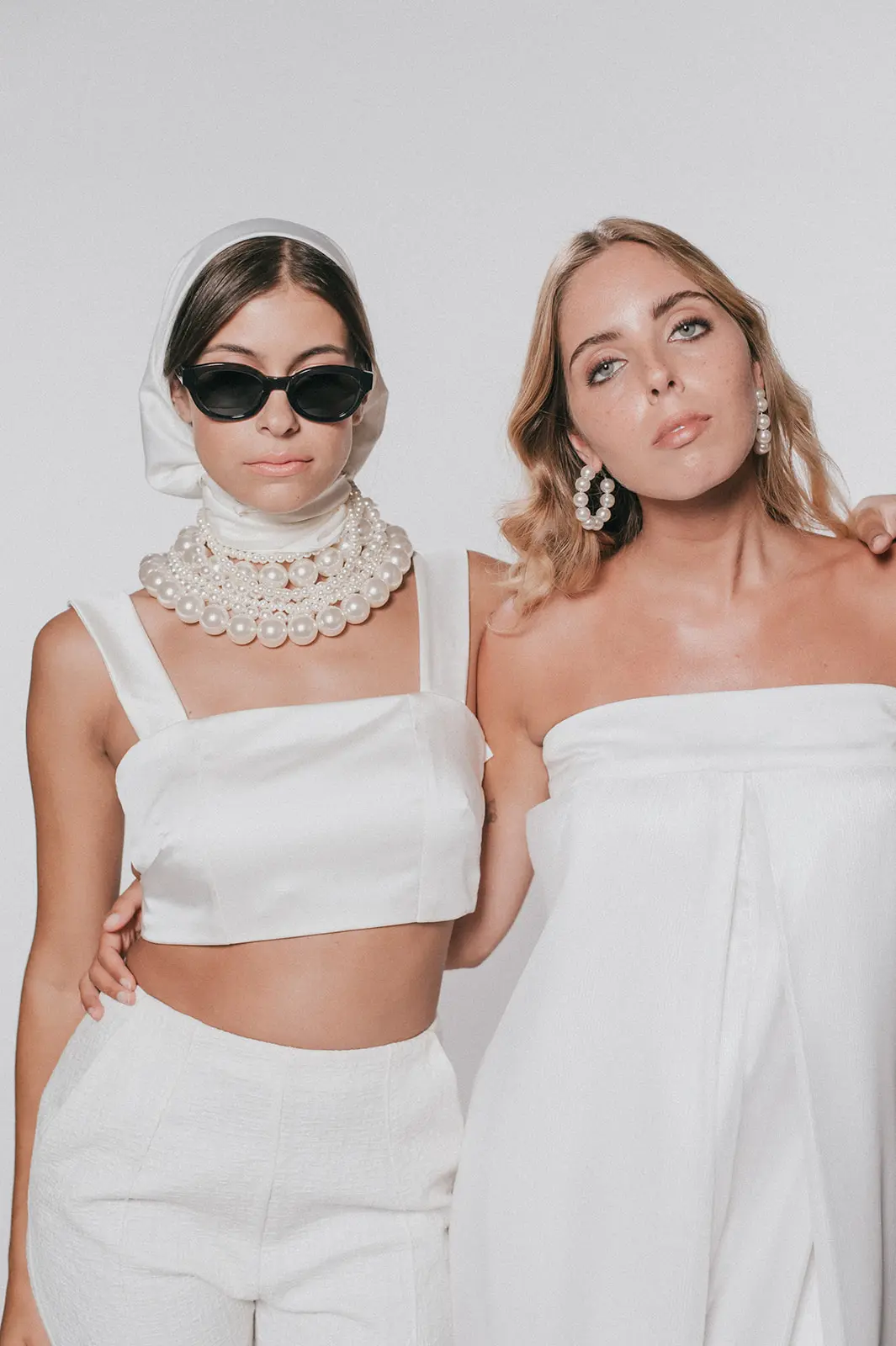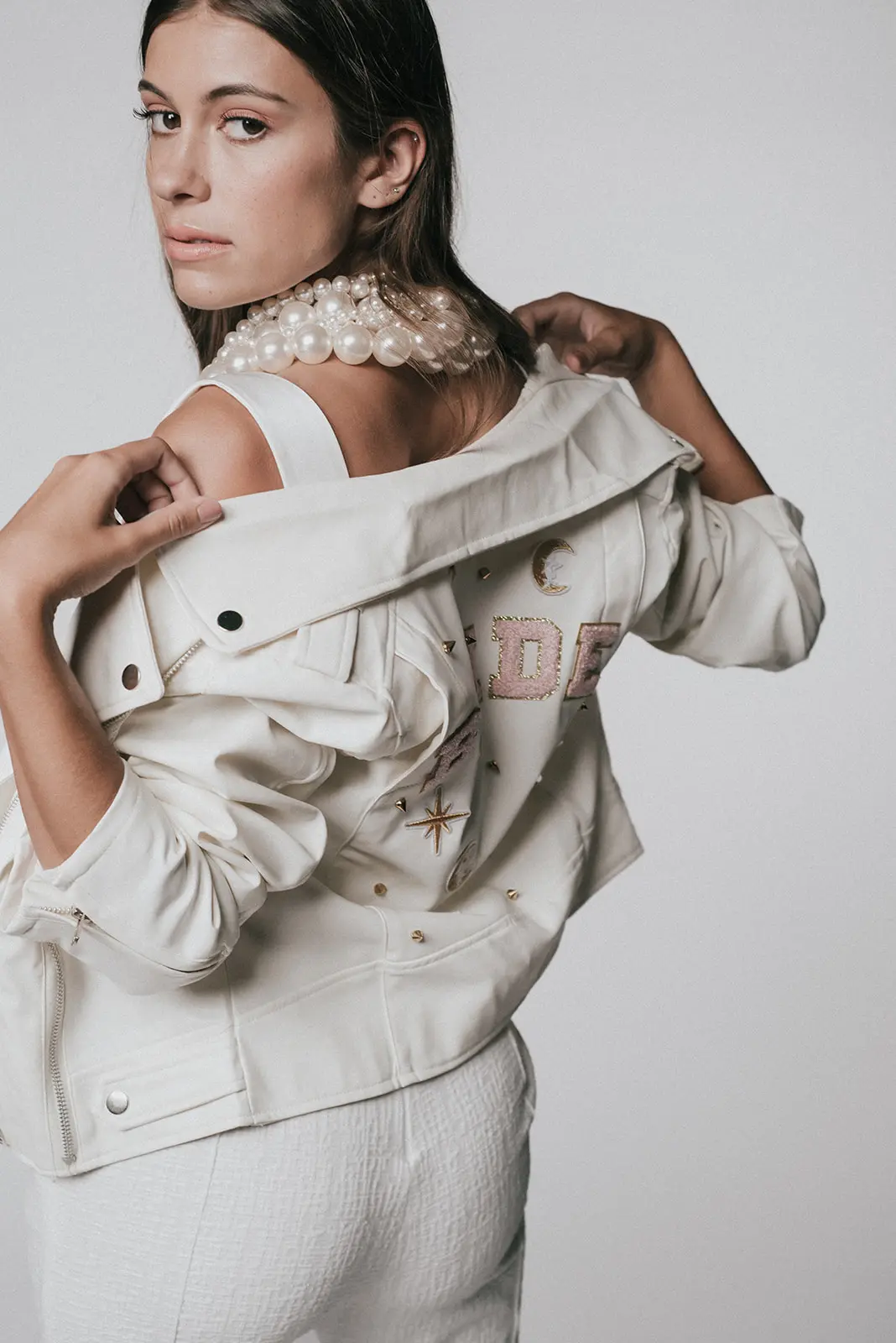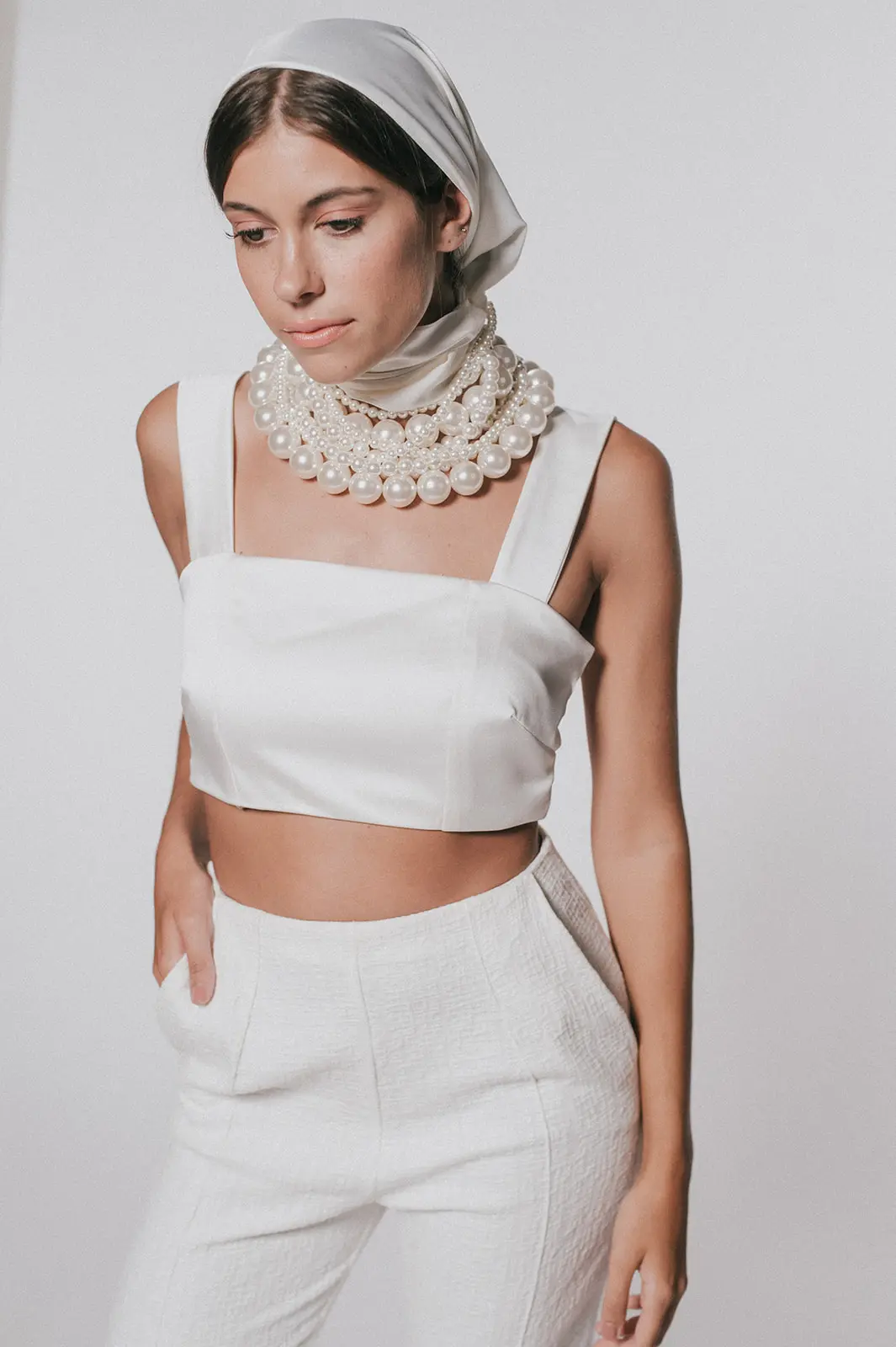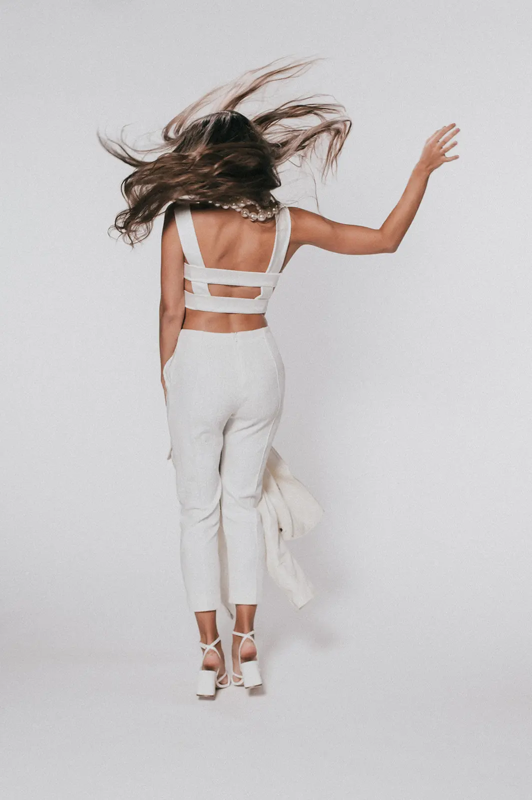 Coordenado que simboliza a liberdade e a aventura, ideal para noivas que querem um toque de rebeldia e preferem calças em vez de saias.