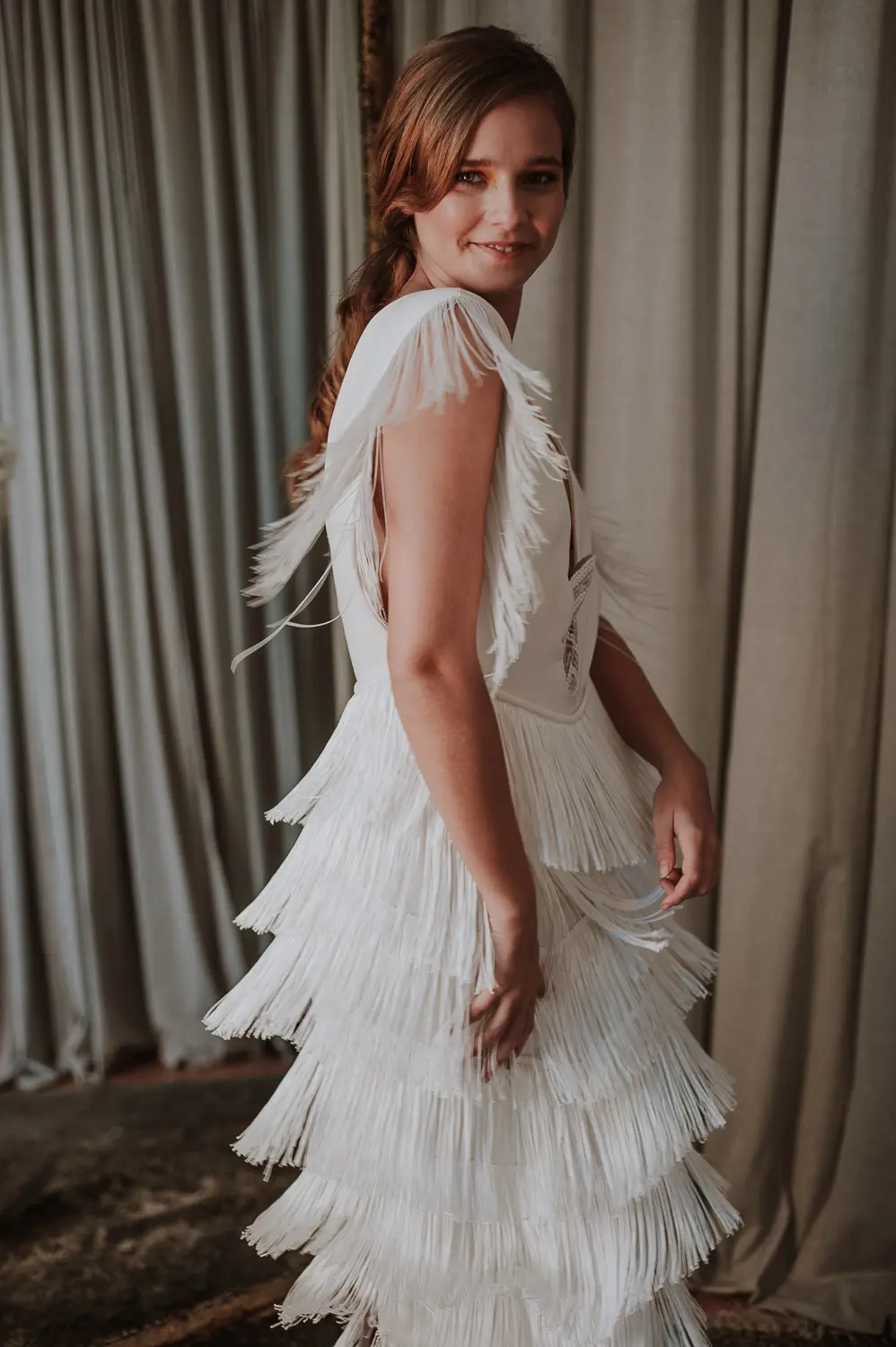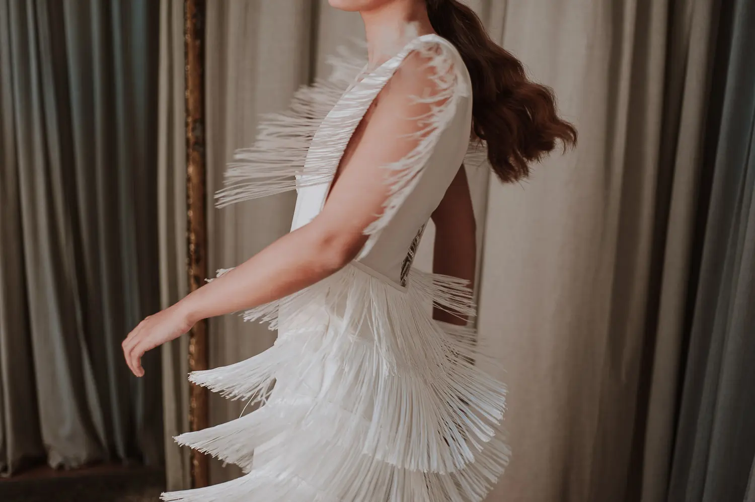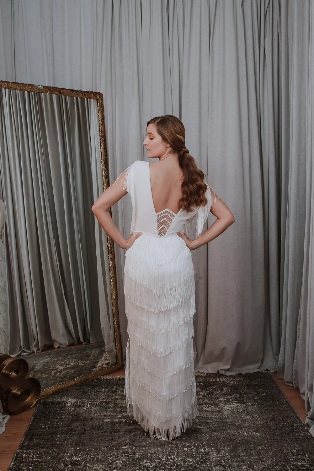 Body com decotes profundos em crepe com aplicação de renda com missangas e lantejoulas e mangas com franjas.