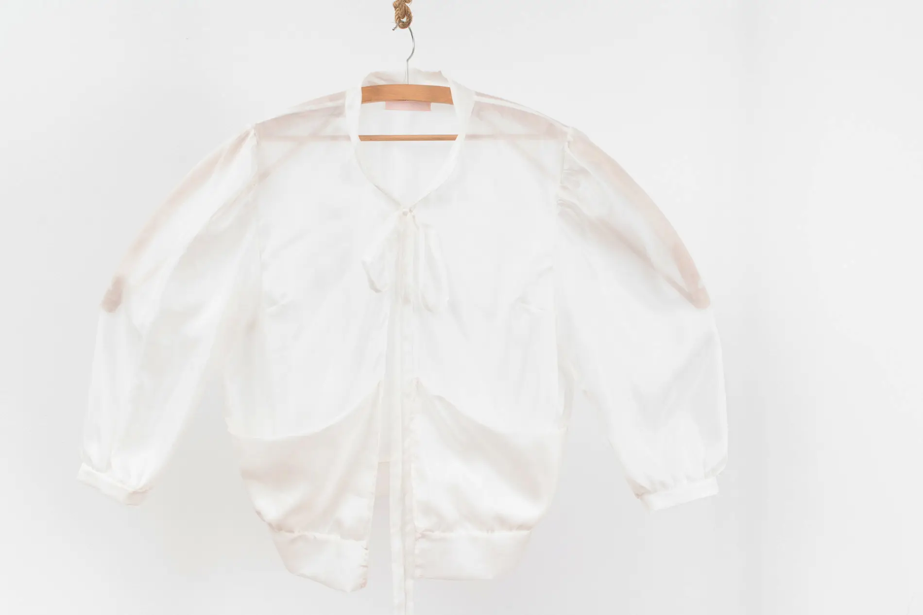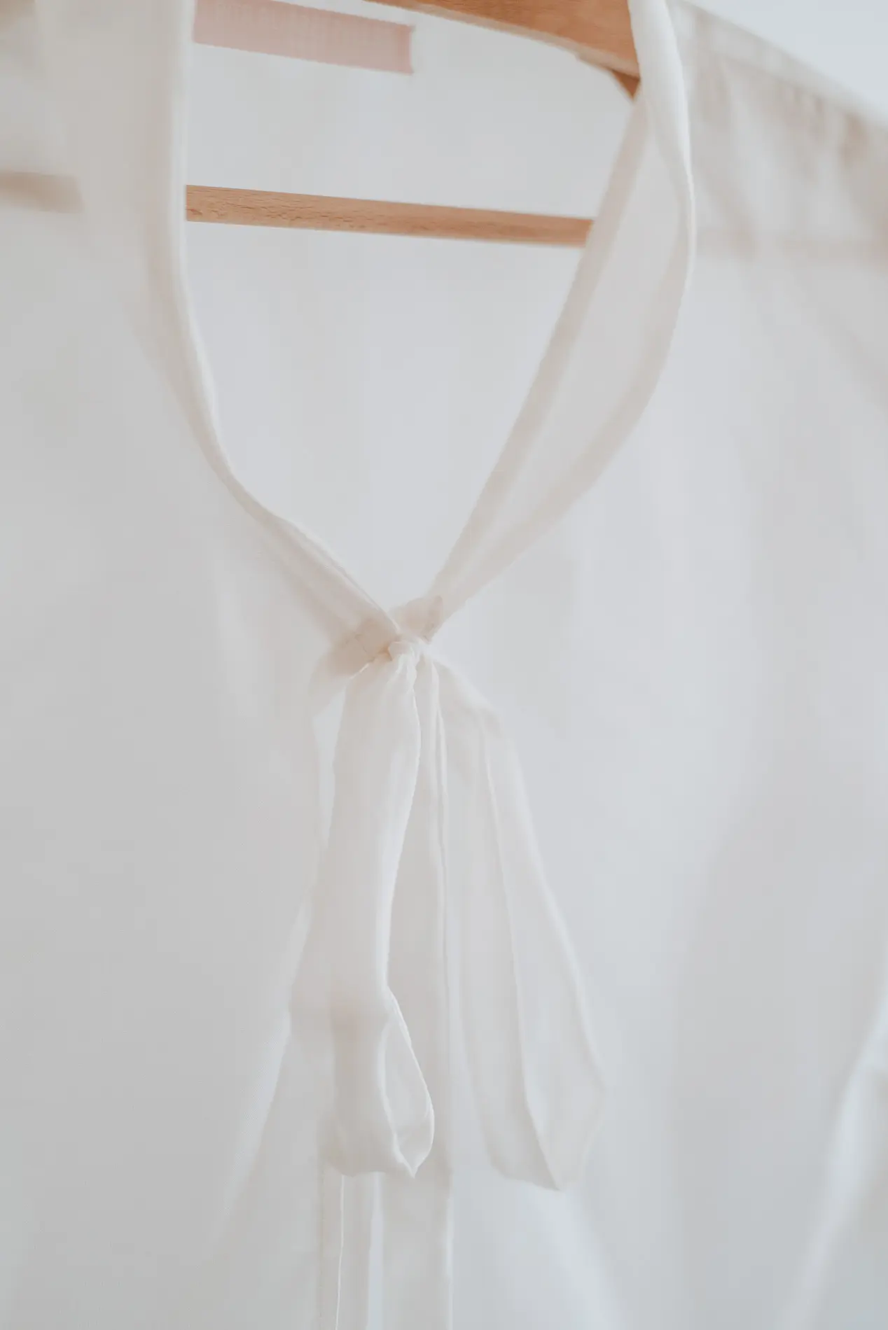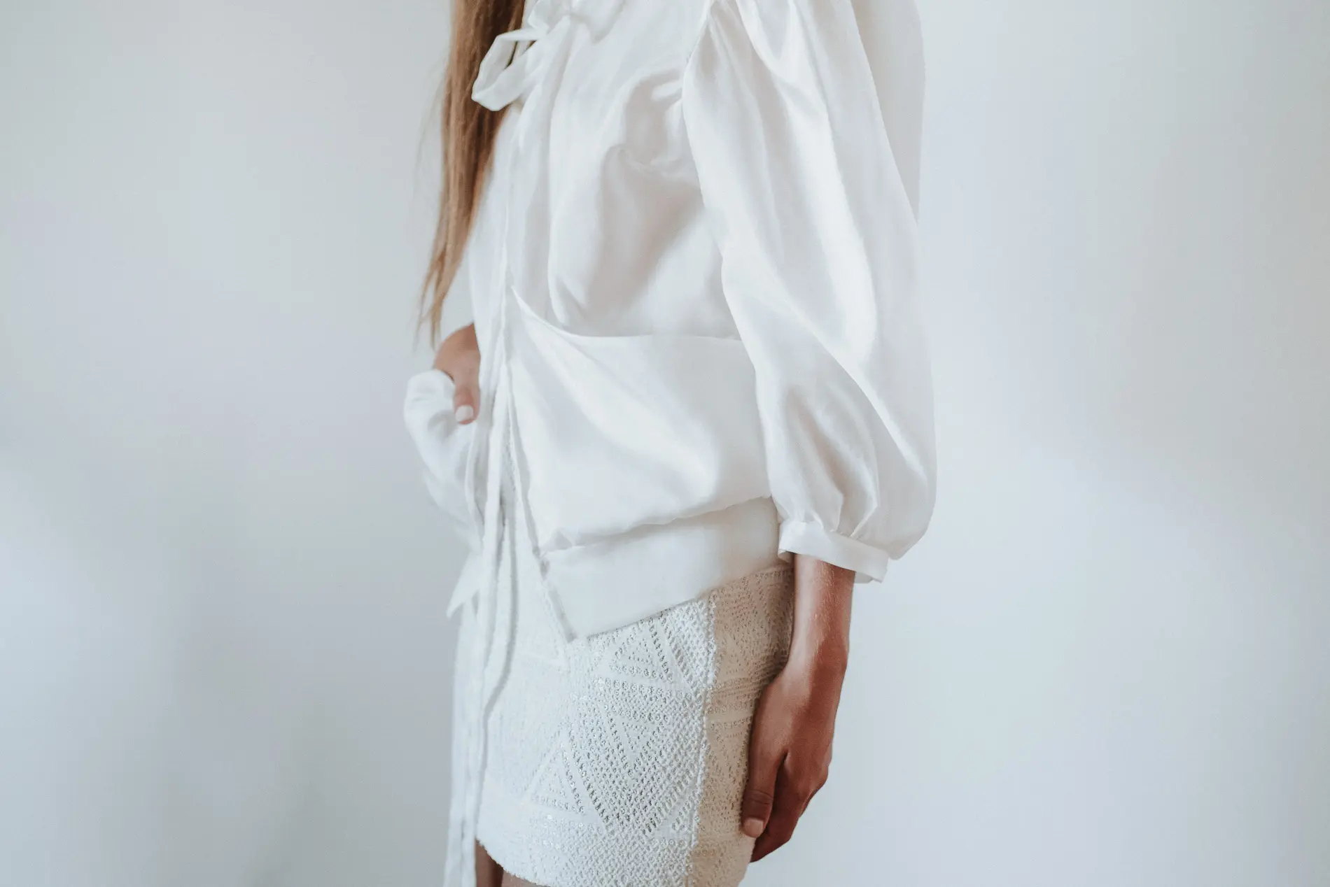 Bomber jacket em organza branco, com fitas para fazer laço no decote.