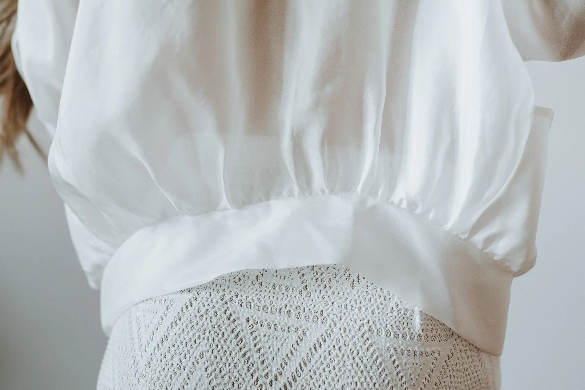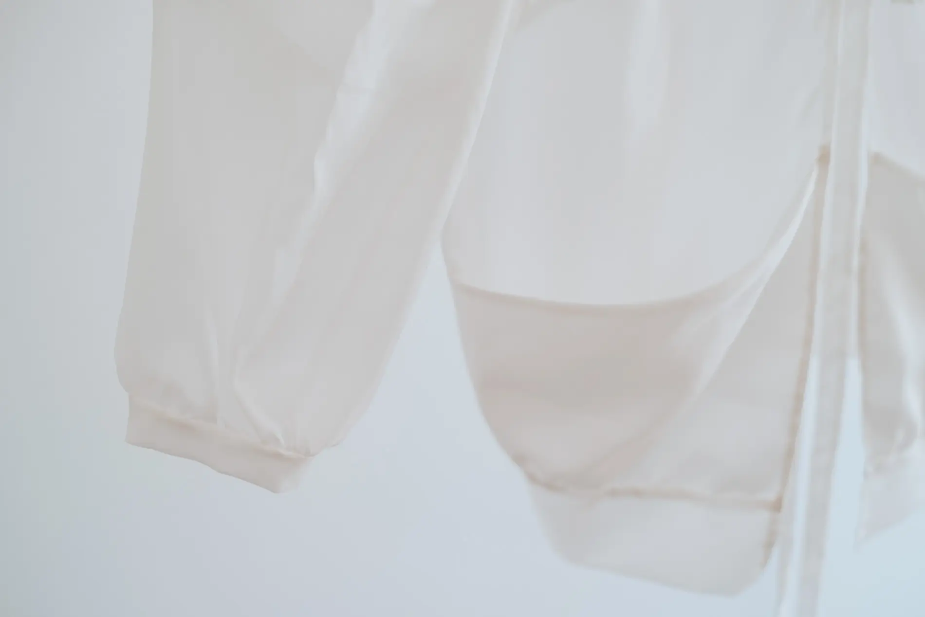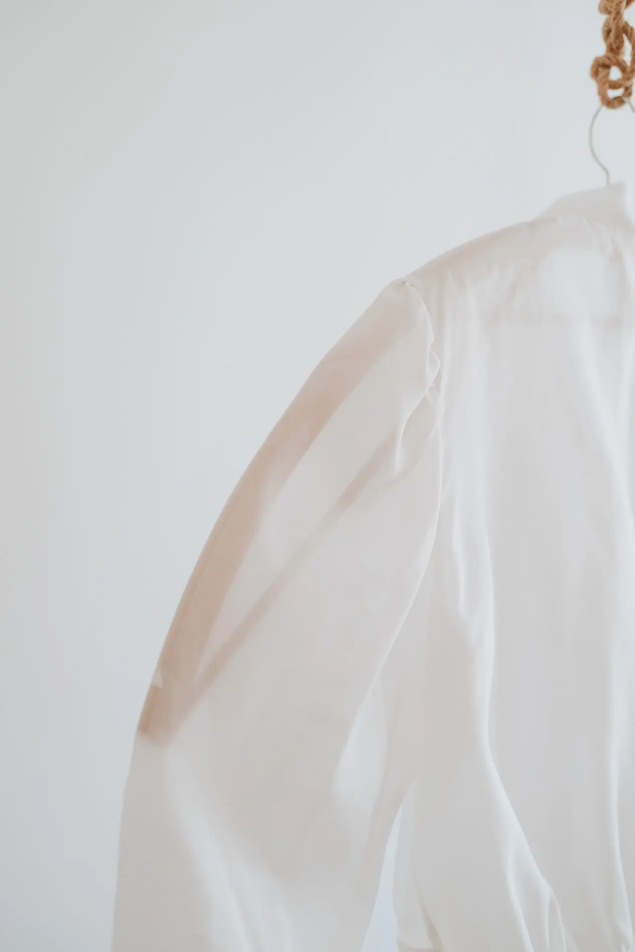 Bomber jacket em organza branco, com fitas para fazer laço no decote.