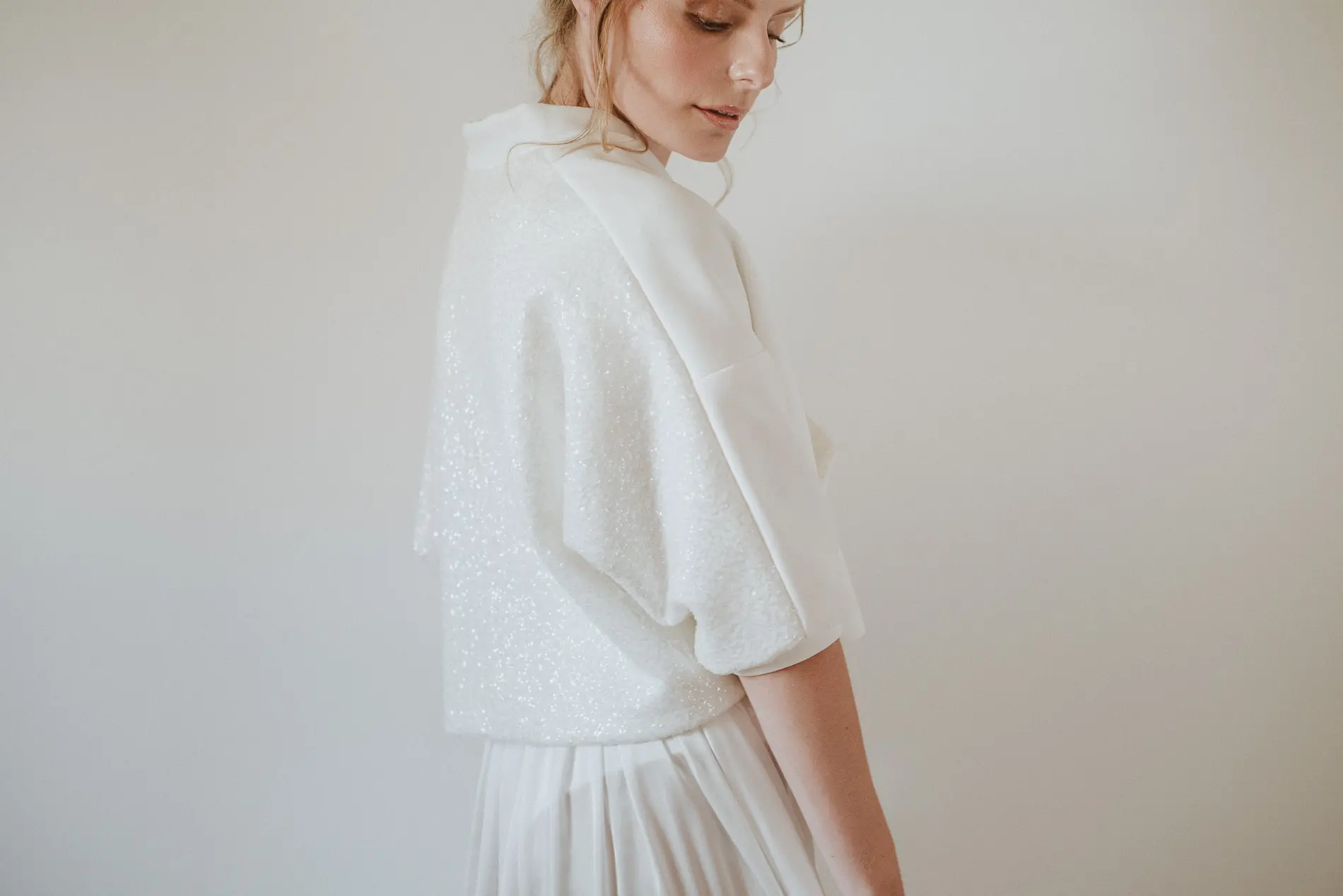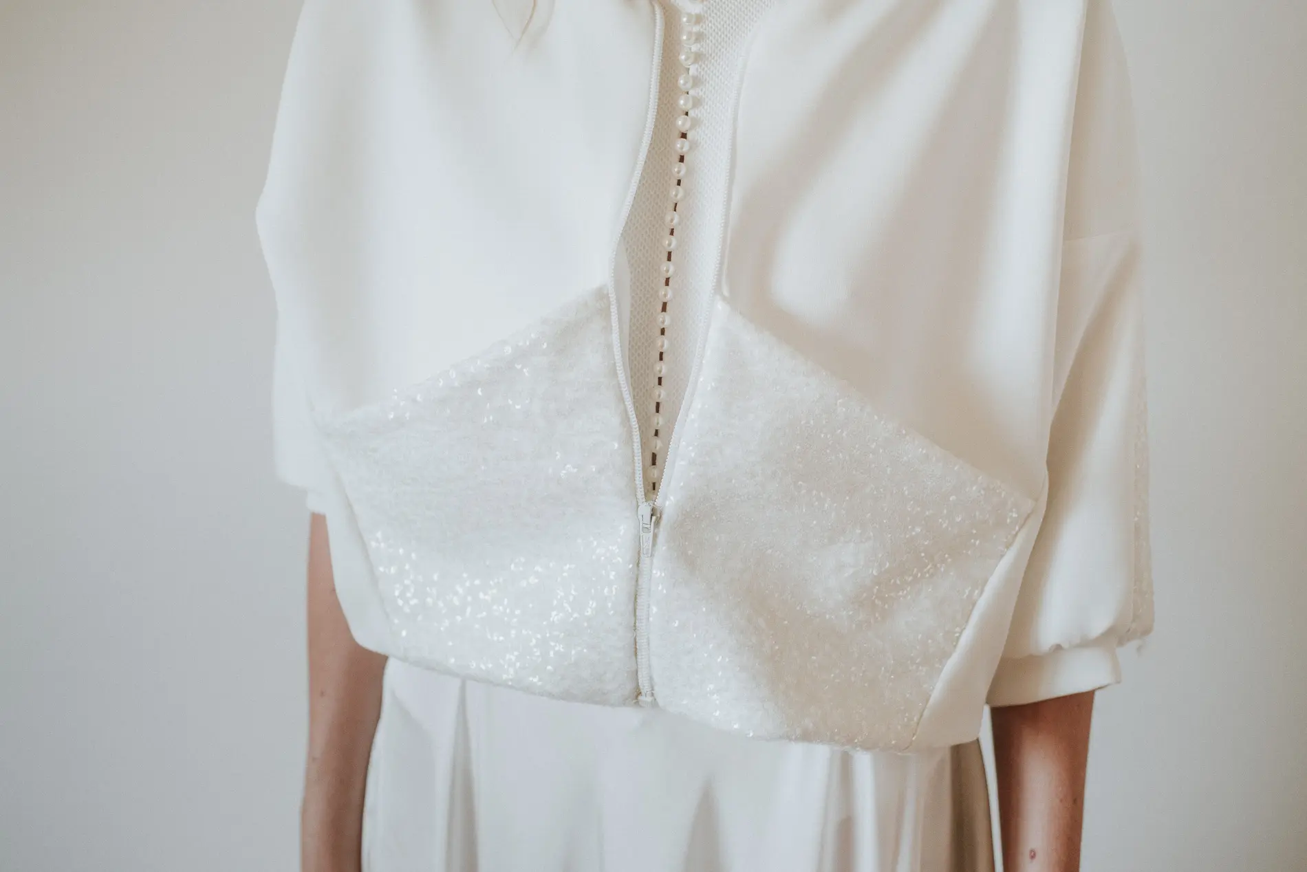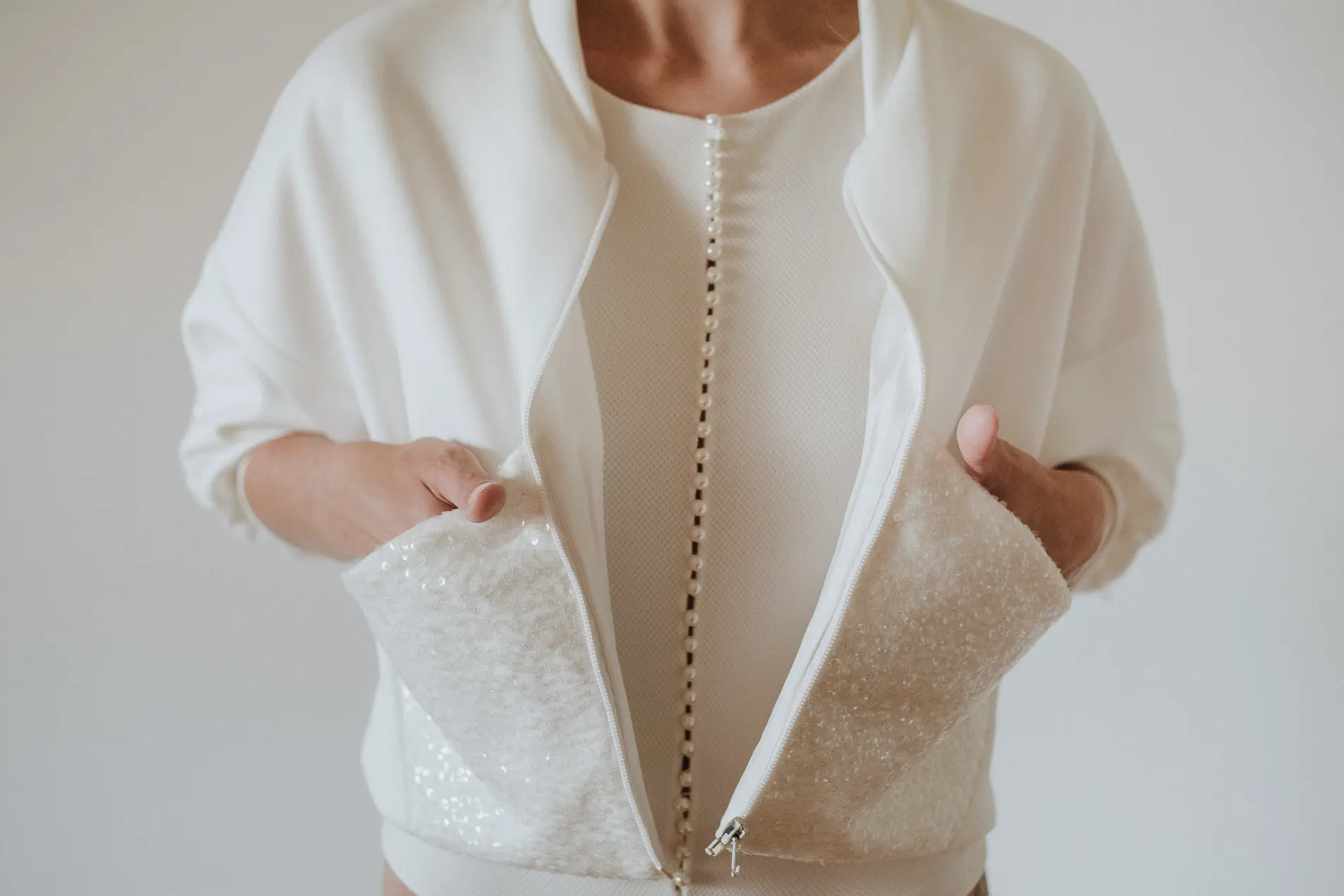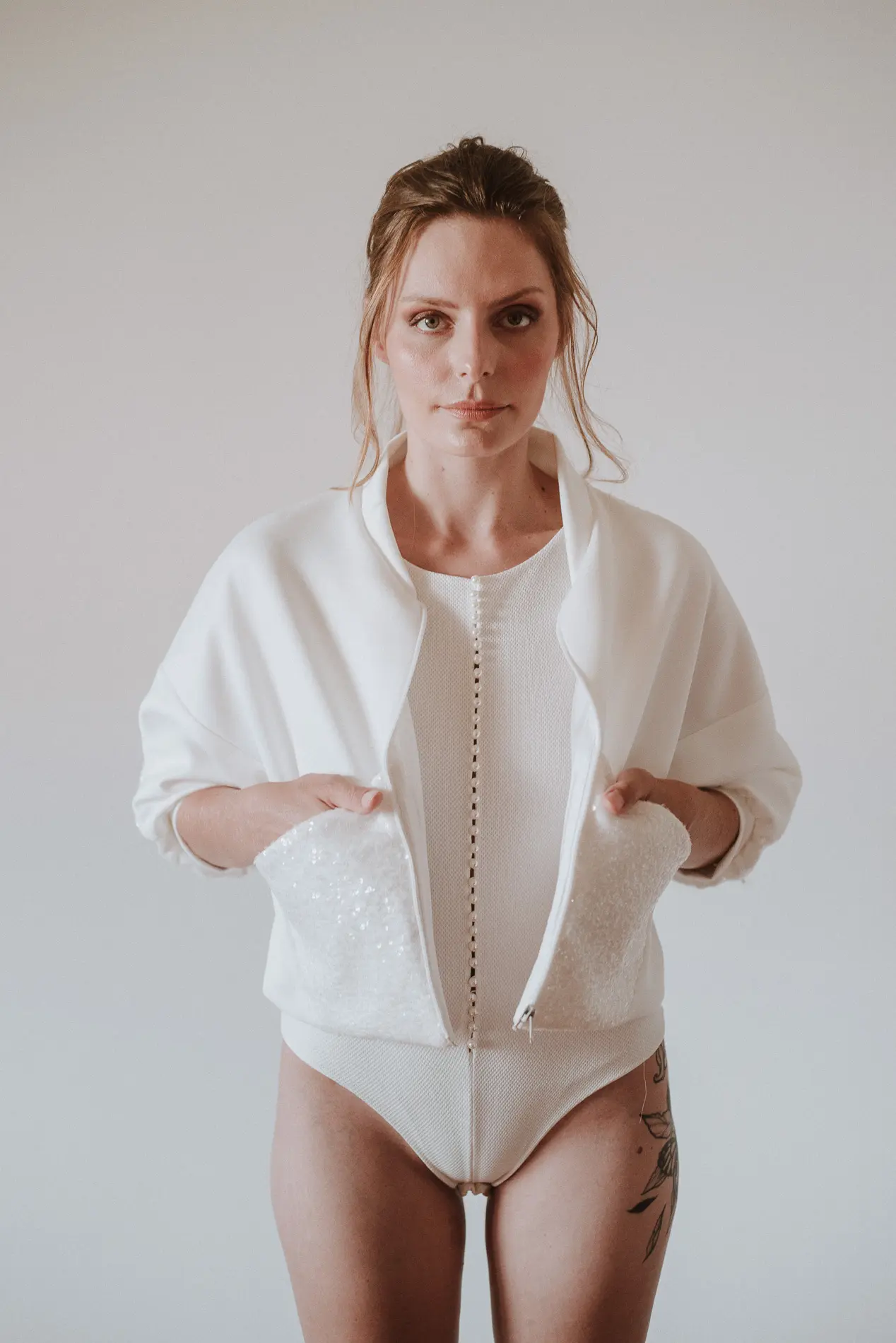 Bomber jacket branco com lantejoulas brancas mas costas e bolsos. Com fecho divisível.