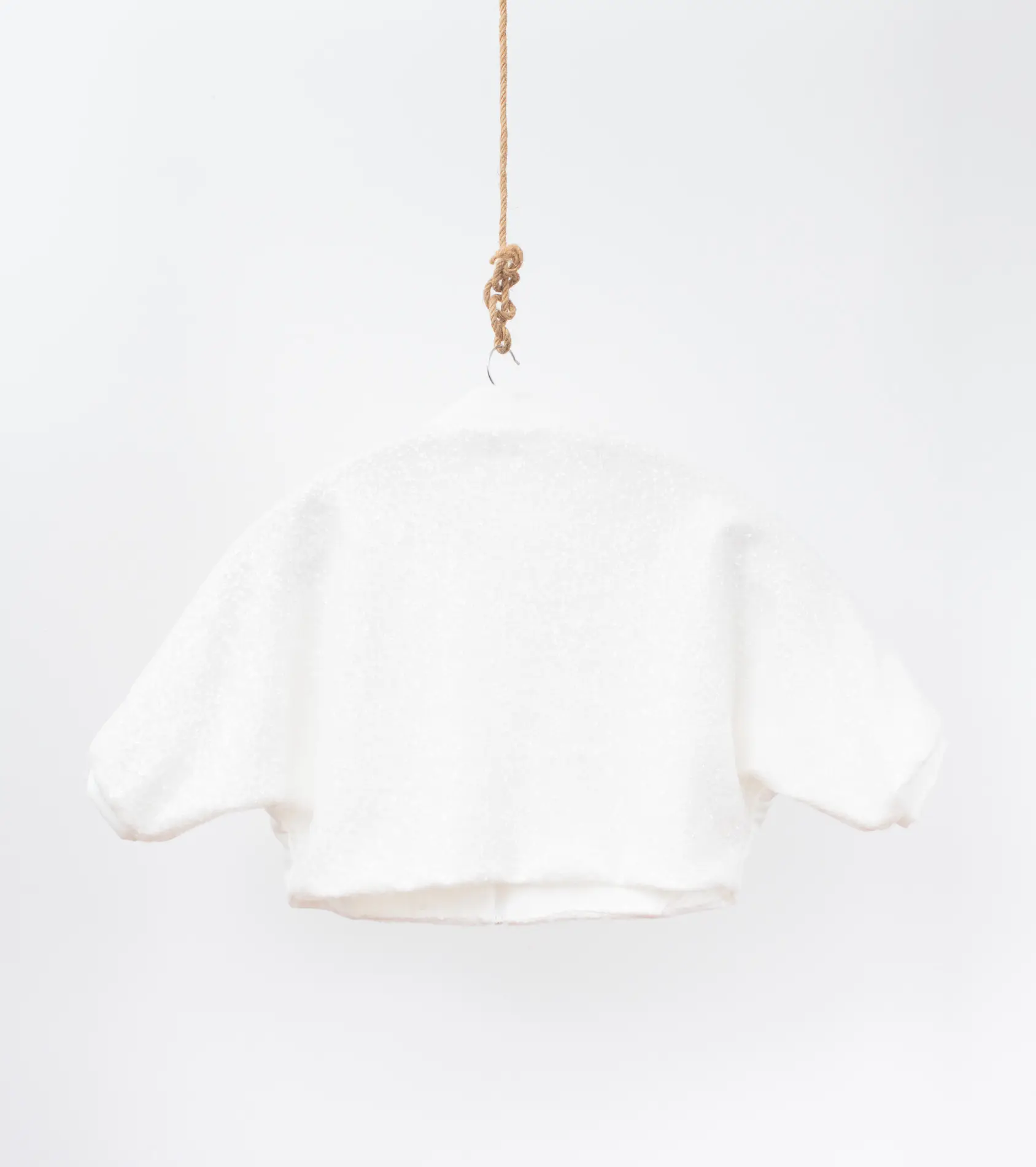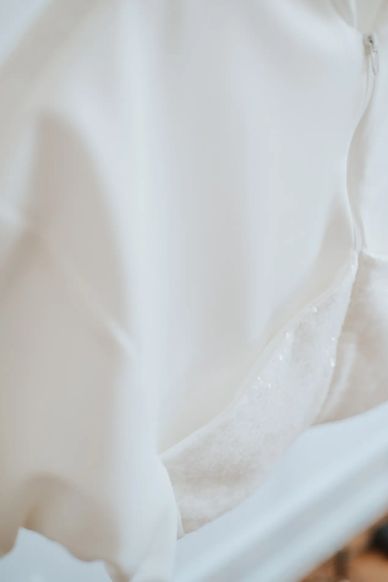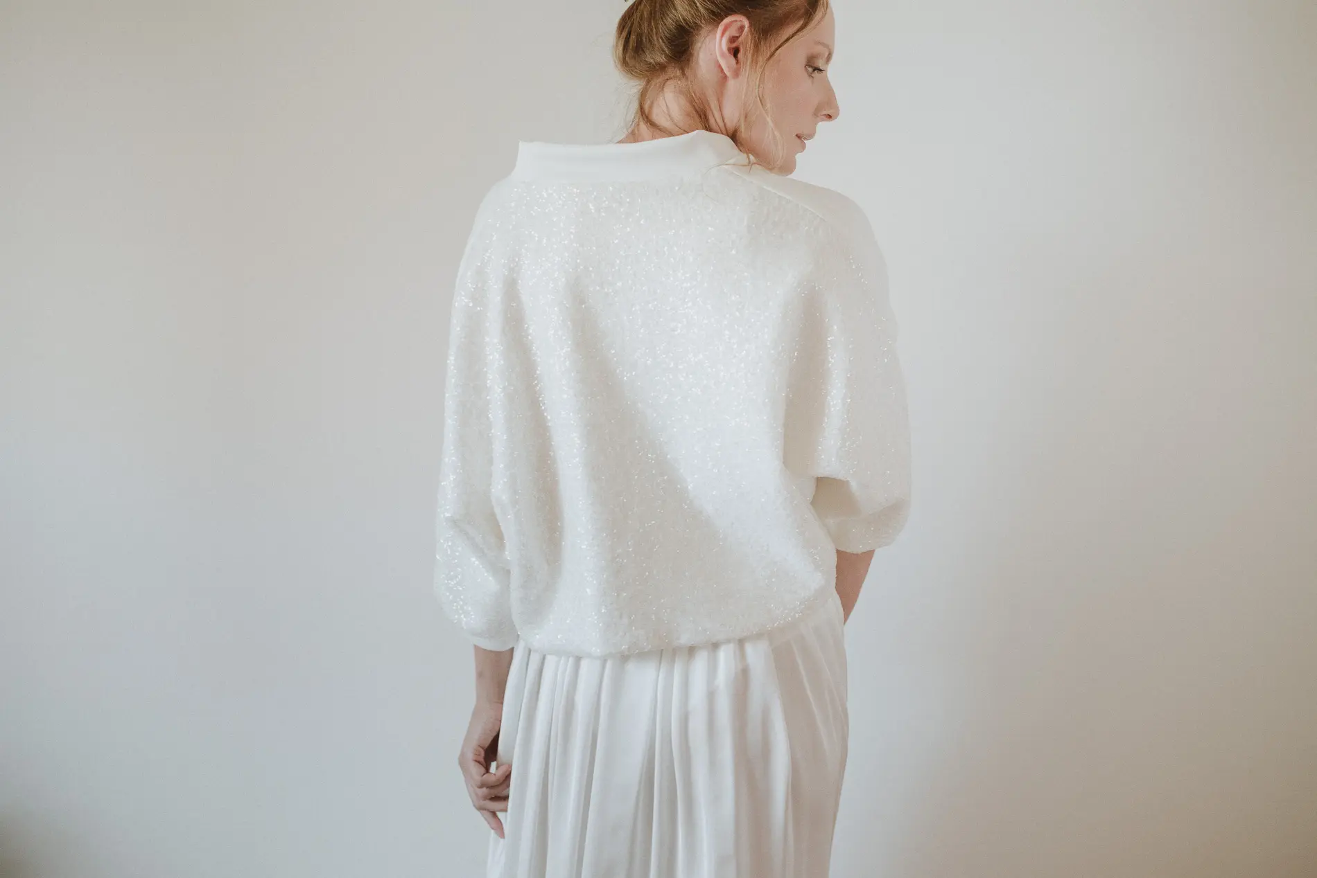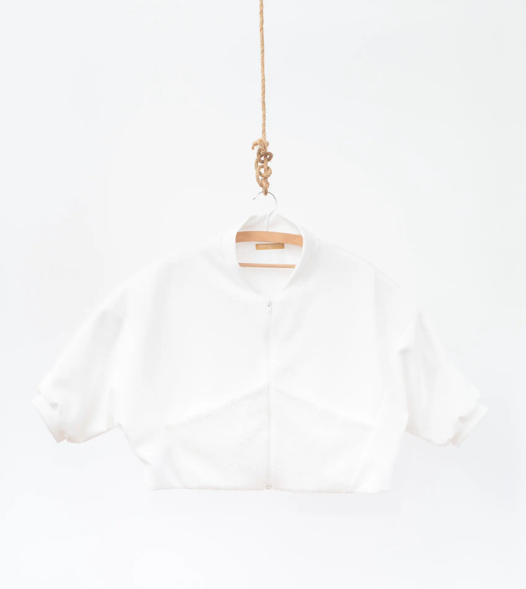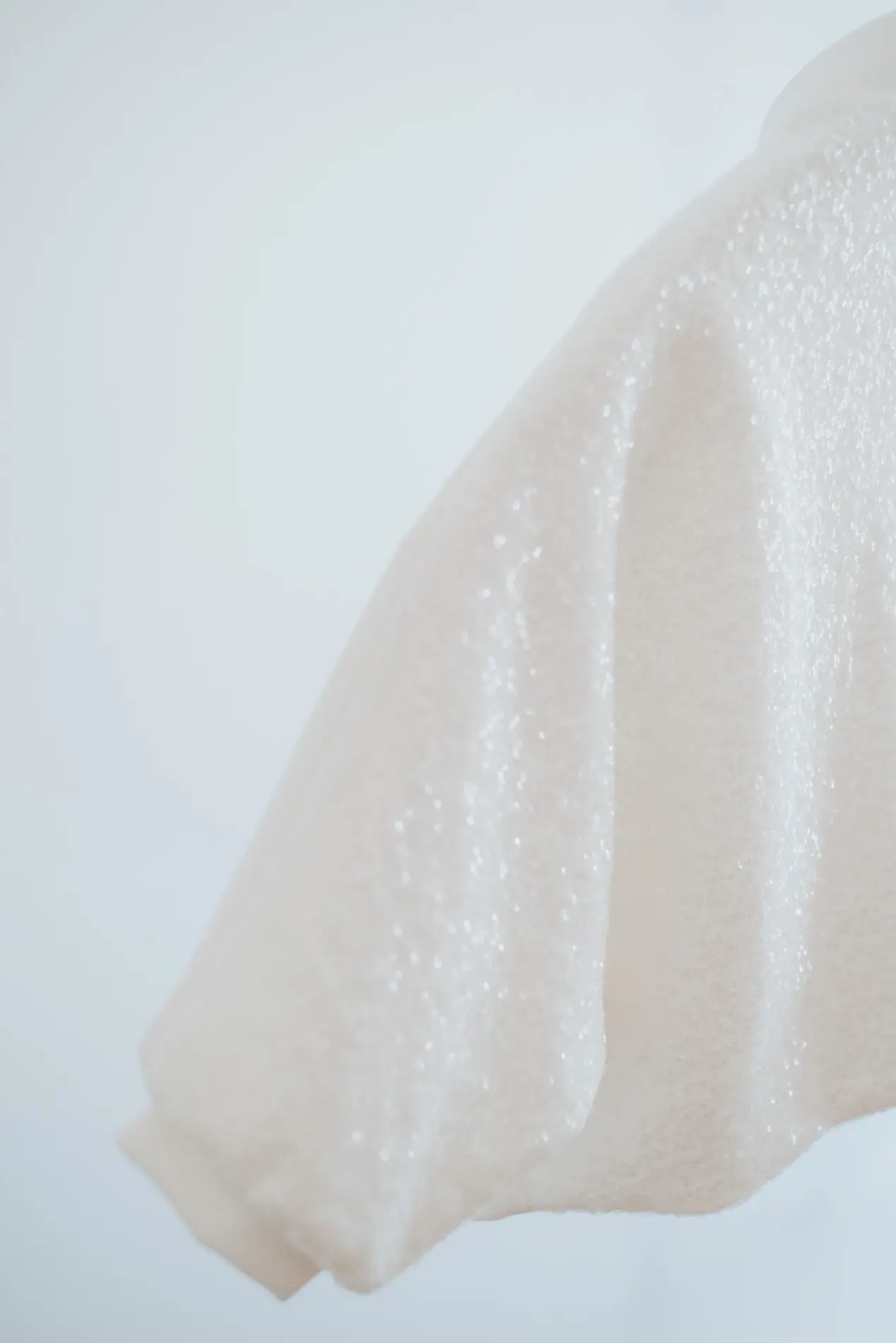 Bomber jacket branco com lantejoulas brancas mas costas e bolsos. Com fecho divisível.