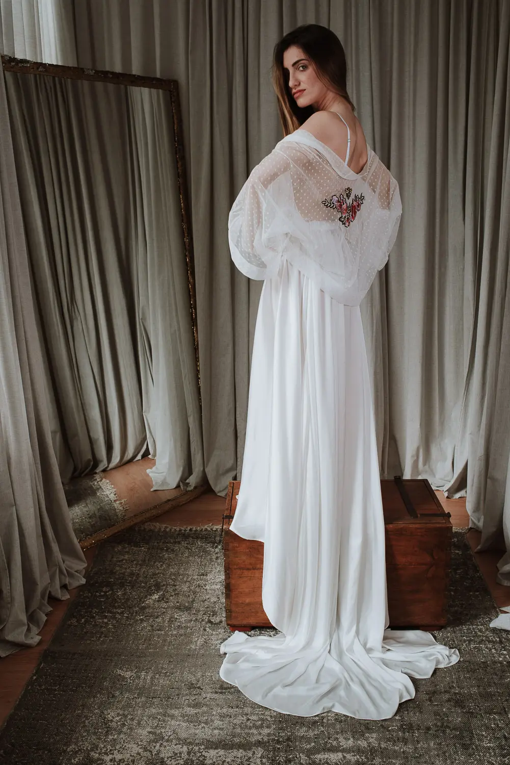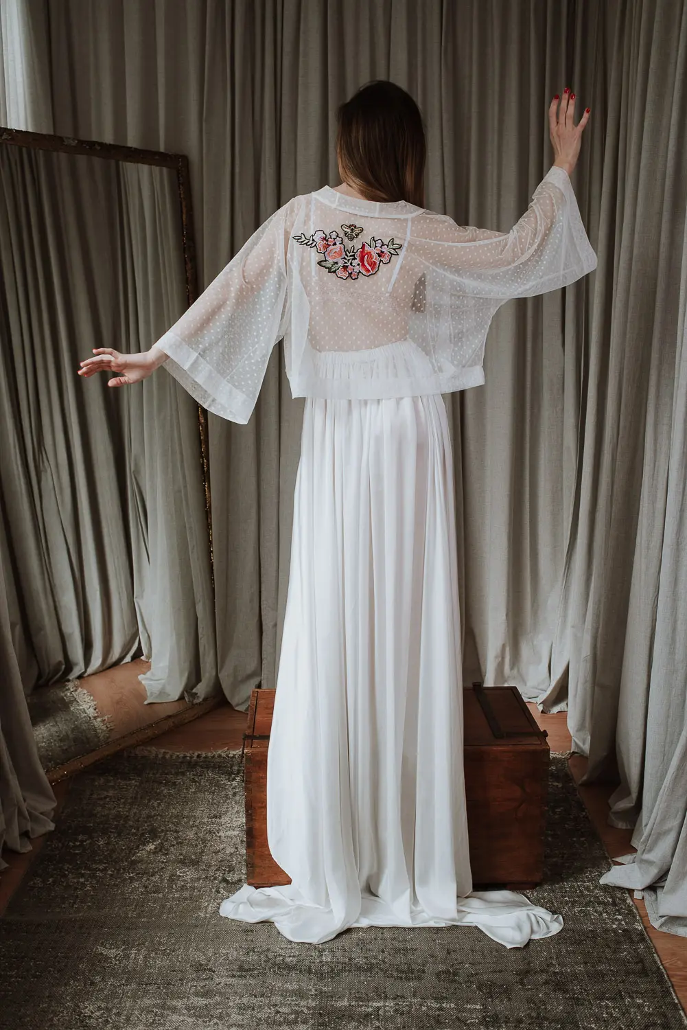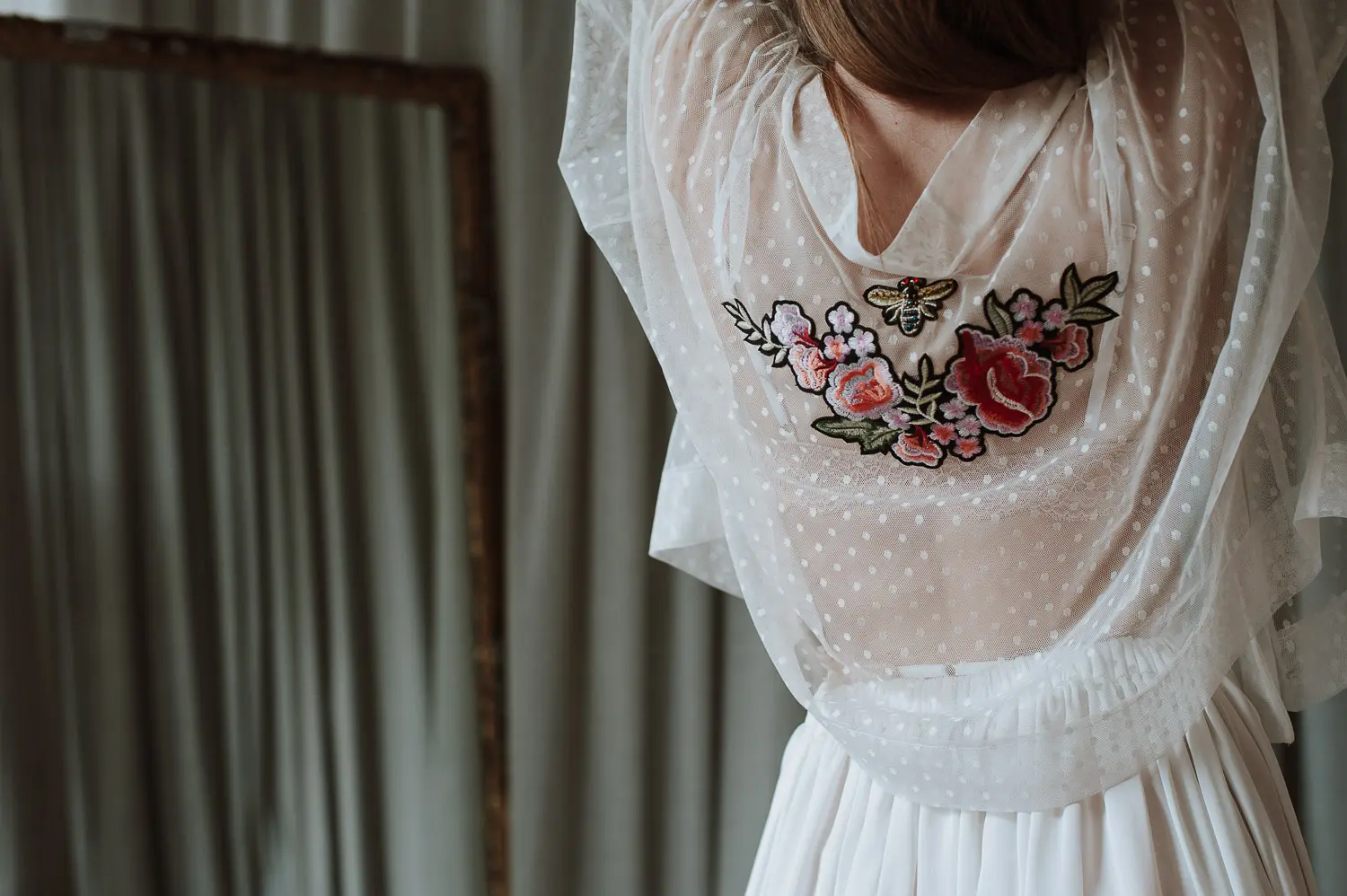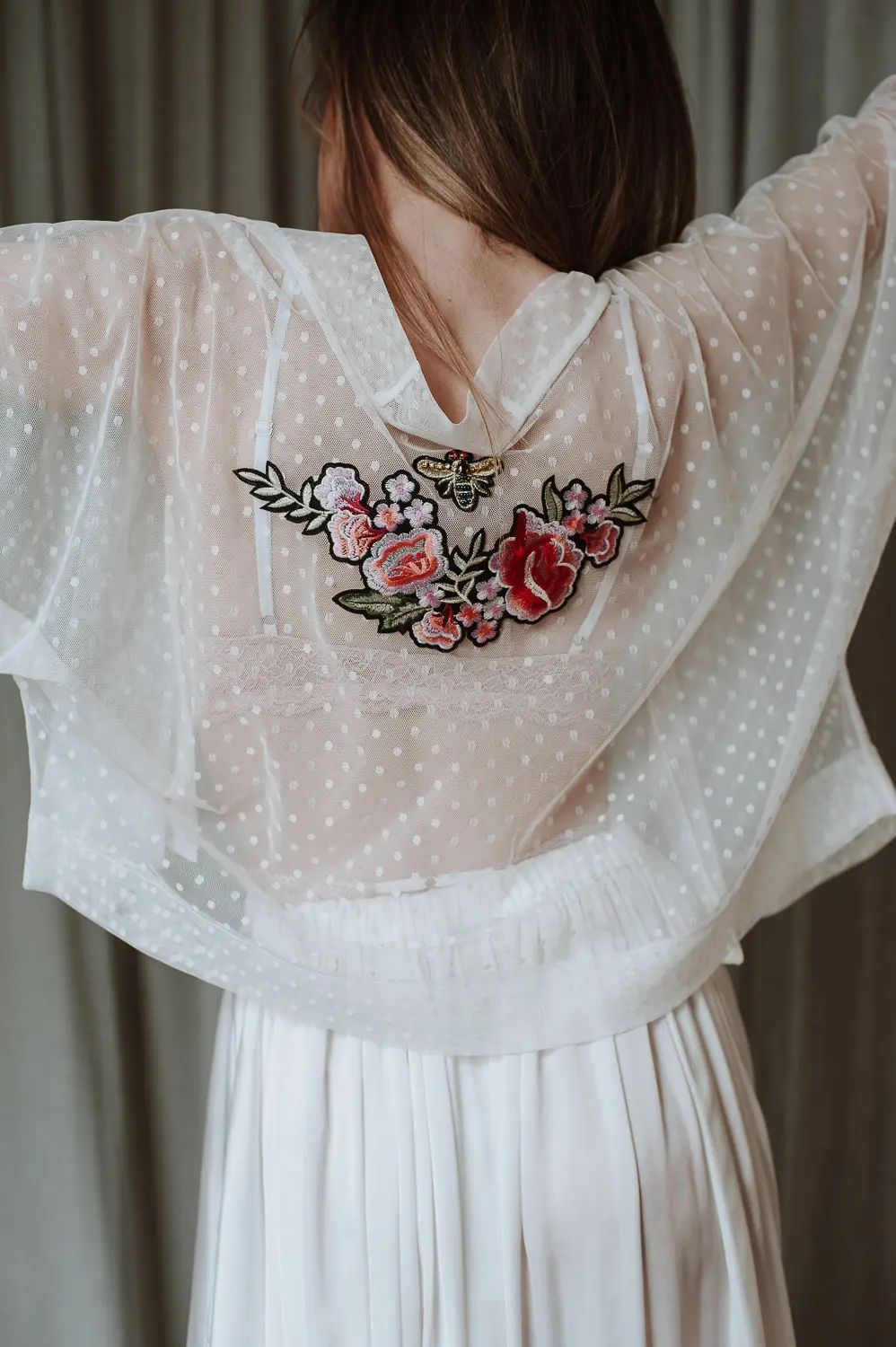 Agasalho (tapa ombros) com polka dots em branco e aplicação de bordado nas costas.