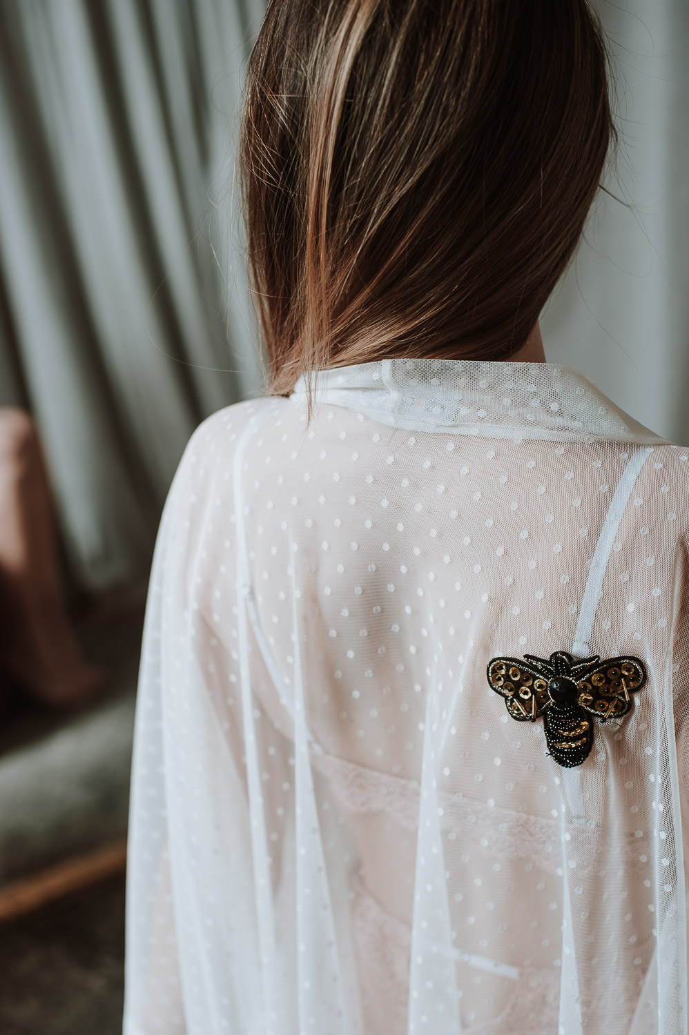 Robe | Kimono branco com polka dots e aplicação de abelha. Fita de cetim às riscas pretas e brancas.
